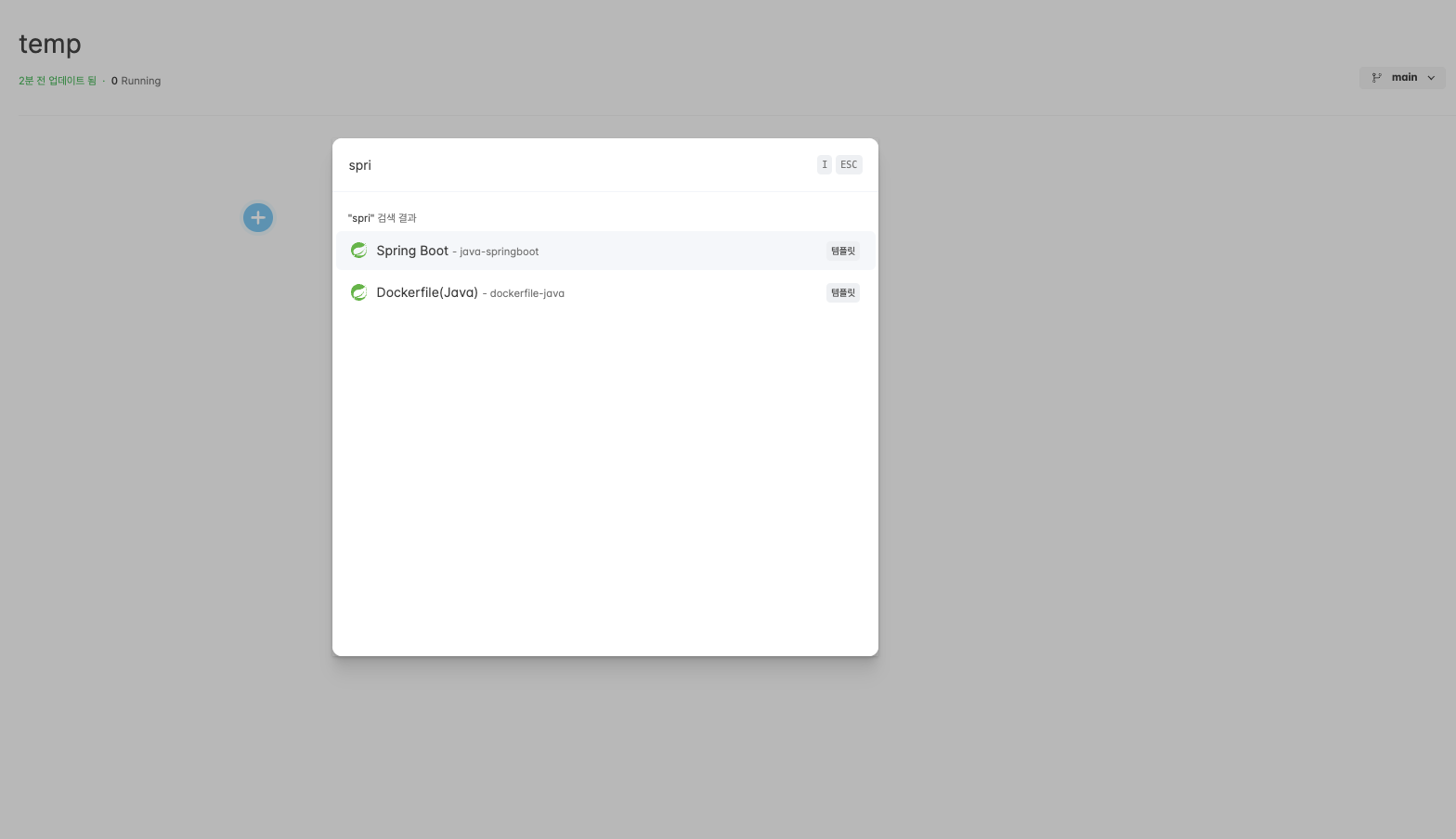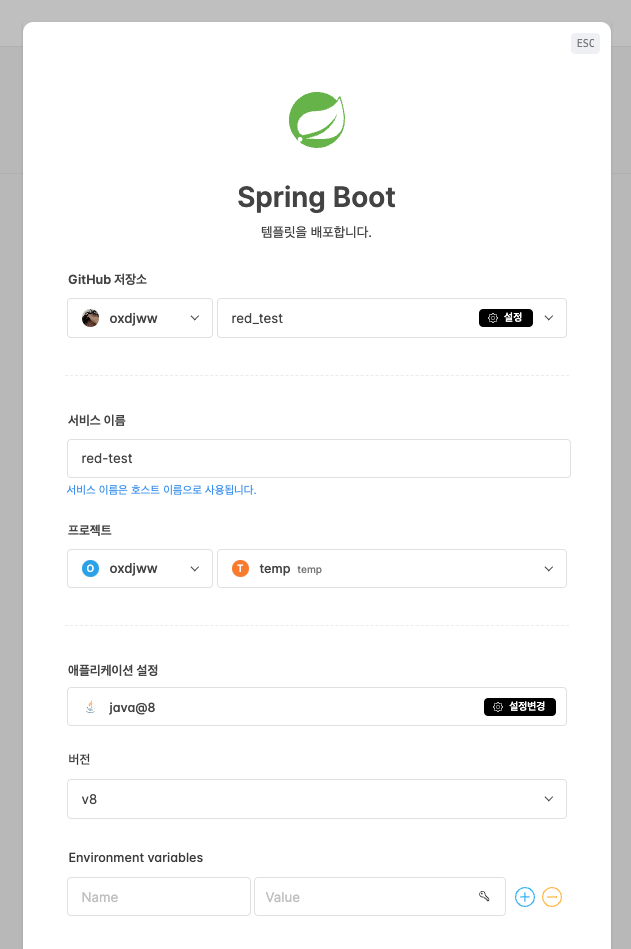 파란색 + 버튼을 클릭 후, 본인이 배포하고자 하는 템플릿인 SpringBoot를 선택해주었다.