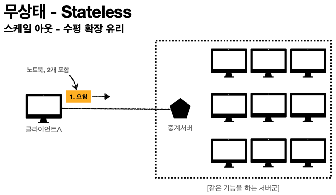 -> 즉, statless기반 통신은 응답 서버의 교체가 용이하다. 이는 무한한 서버 증설이 가능함을 의미한다.
