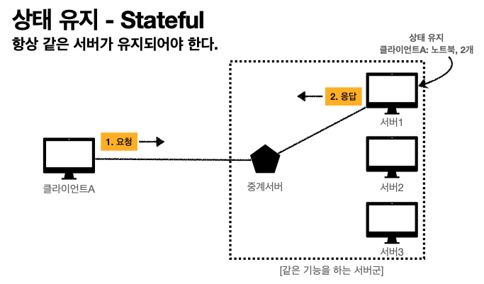 서버가 상태를 유지하며 저장하고 있기 때문에 한 클라이언트에 대해서 같은 서버가 계속 응답해야 하는 구조이다.