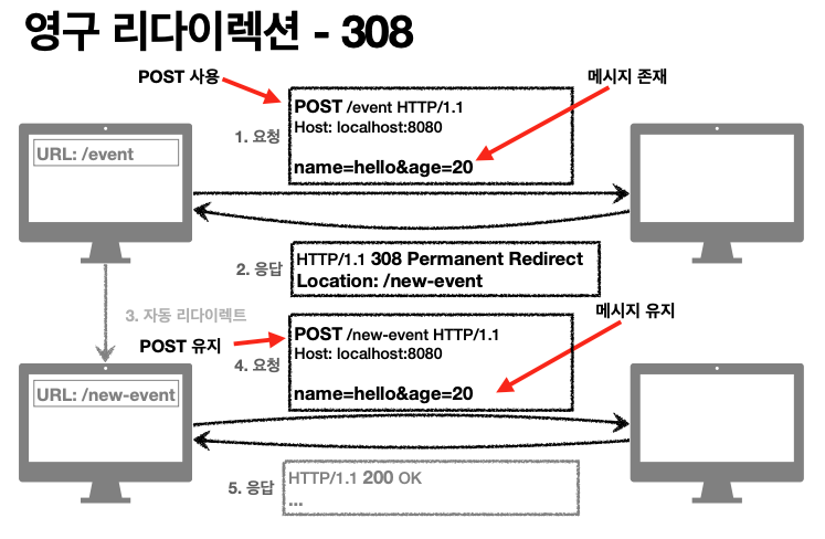 - 리다이렉트시 요청 메서드와 본문 유지(요청 메서드를 변경하면 안된다. MUST NOT)