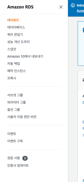 AWS 콘솔 홈에서 데이터베이스를 선택하고 데이터베이스 생성하기를 클릭해준다
