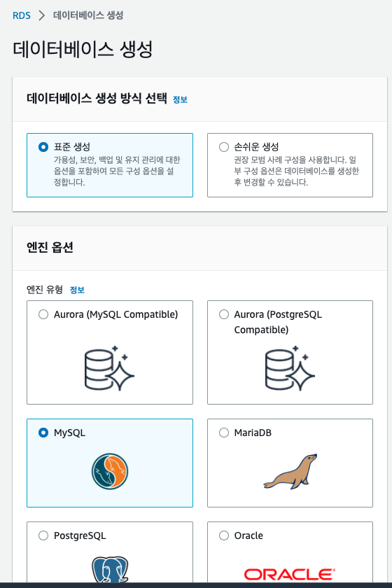 AWS 콘솔 홈에서 데이터베이스를 선택하고 데이터베이스 생성하기를 클릭해준다