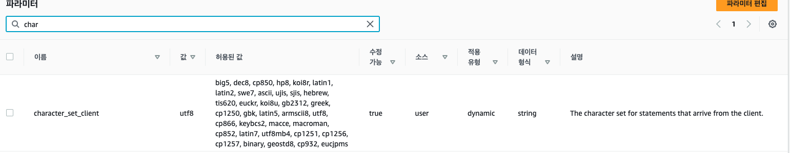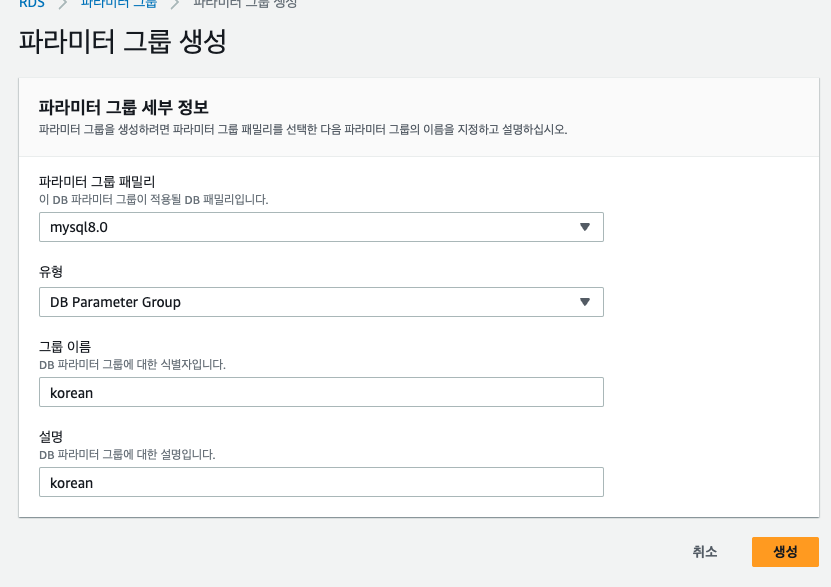 한글 설정을 위해 파라미터 그룹을 생성해준다