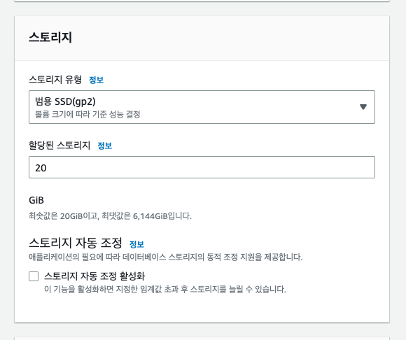 스토리지는 최솟값인 20GB로 설정해준다!!!