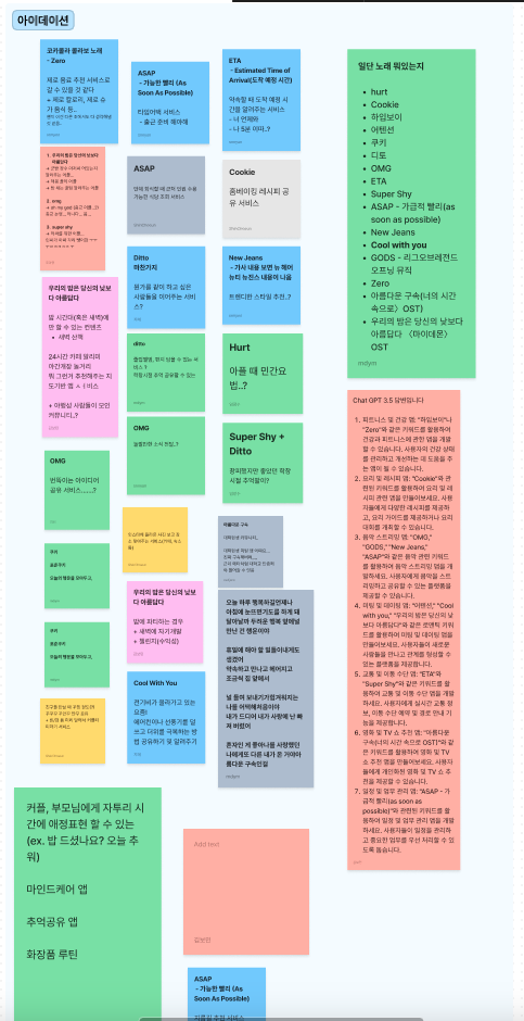'구현 가능할지' 보다는 주제에 맞게 figma에 포스트잇을 붙이고, 최대한 많은 아이디어를 내며 짧은 시간 내에 괜찮은 아이디어가 나올지 다들 고민했다.
