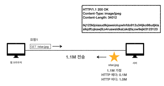 Intro 본 포스팅에서는 캐시 기본 동작에 대해 다룬다. 캐시의 필요성 클라이언트는 웹 서버에 다양한 리소스를 요청하고, 이를 요청하는 클라이언트는 다수이다. 이 때 캐시가 있는 상황과 없는 상황을 가정하고 캐시가 필요한 이유에 대해 학습할 수 있다. 캐시가 없을 때 첫 번째 요청 캐시가 없는 상황에서, 클라이언트가 star.jpg라는 이미지 파일을 서버에 요청해서 받아오는 상황이다. 서버가 클라이언트로부터 GET요청을 받고 이미지 리소스를 돌려주는데 이 때 데이터의 크기는 1.1M로, 헤더 0.1M과 이미지 파일 본체인 바디는 1.0M로 이루어져있다. 두 번째 요청 클라이언트로부터 몇번의 요청이 오든 서버에서는 같은 1.1M 크기의 파일을 전송한다. 데이터가 변경되지 않아도 계속 네트워크를 통해 데이..