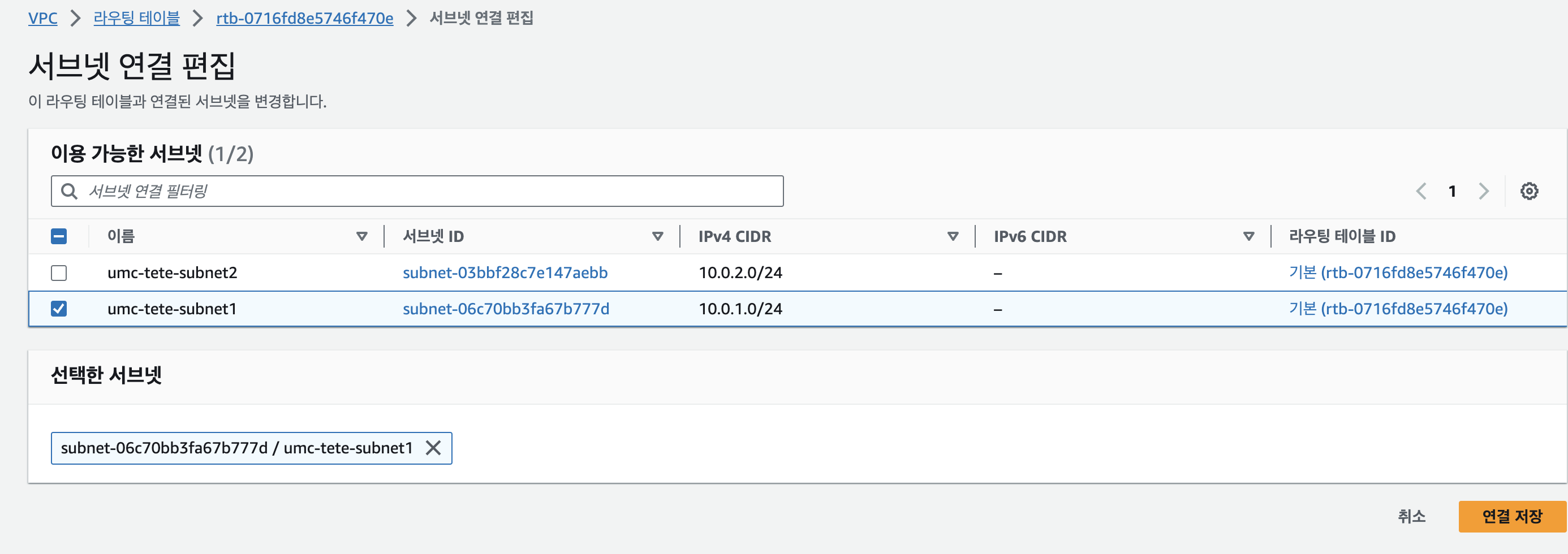 라우팅 테이블을 서브넷(public subnet으으로 설정할umc-tete-subnet1)과 연결해준다.