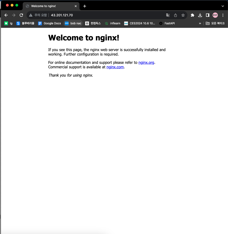 EC2 Instance의 IP주소로 접근 시 다음과 같은 nginx welcome page를 볼 수 있다!