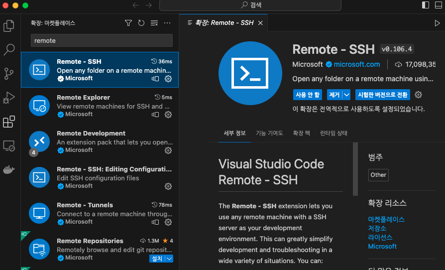VSCode좌측 탭에서확장(Extension)을 선택하고, 아래와 같이 검색 후 설치한다.