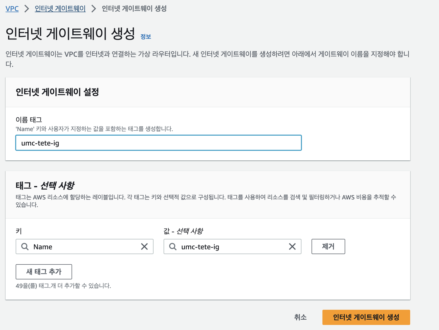 umc-tete-subnet1을public subnet으로 쓰기 위해Internet Gateway를 연결해줄 차례이다.