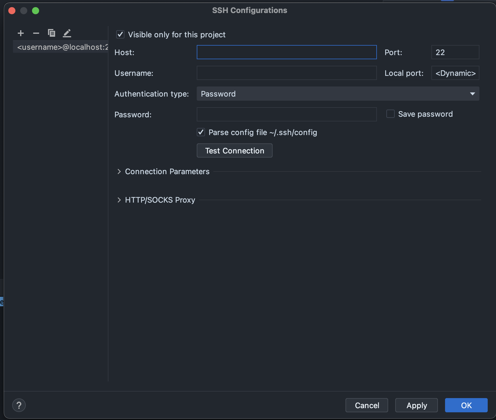 SSH configuration우측 끝에 있는...버튼을 클릭하여SSH접속 관련 설정을 해줄 것이다.