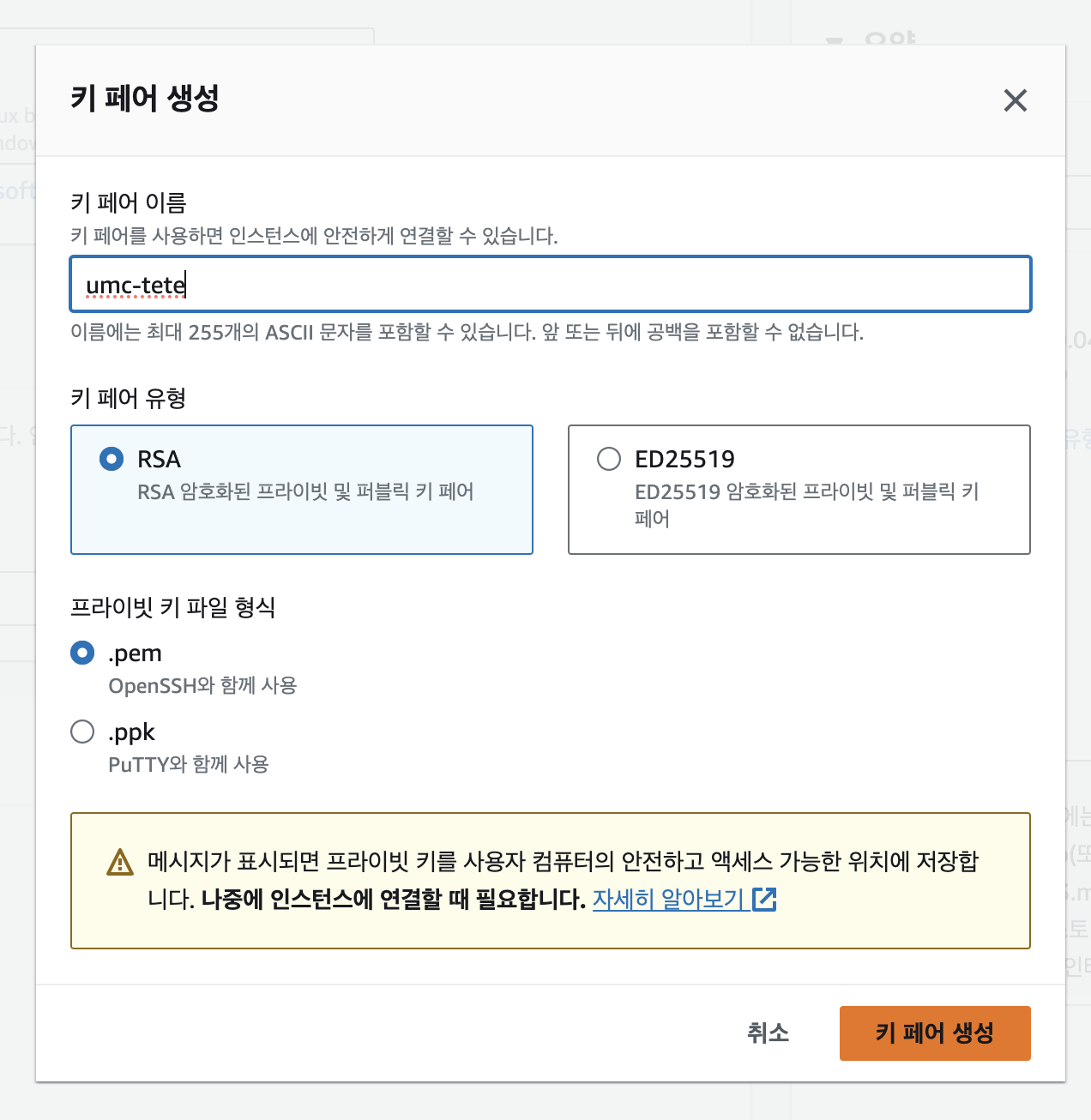 EC2 인스턴스에 접속하기 위해서는 공개키/개인키의 키 쌍이 필요한데, 이를RSA와*.pem형식으로 생성해준다.