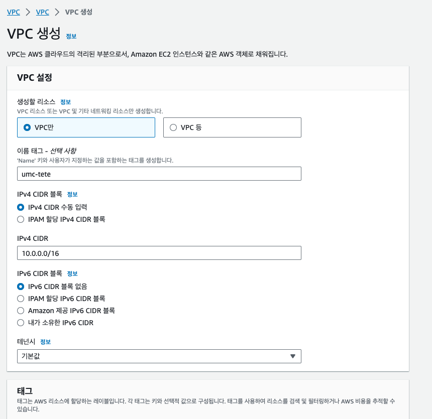 b.VPC의CIDR을10.0.0.0/16으로 설정하고, 이를 나중에서브넷으로 나눌 것이다.
