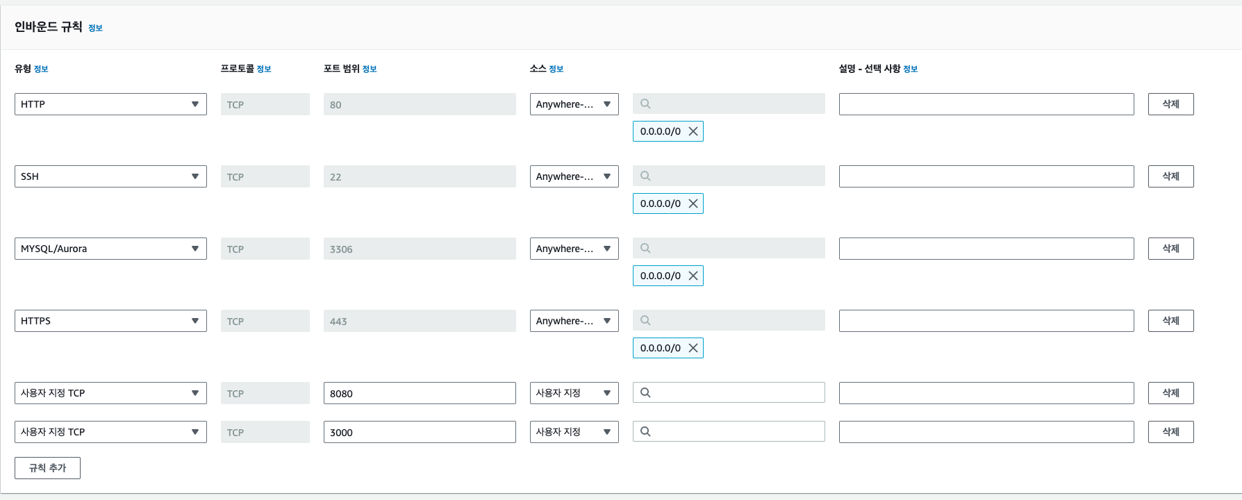 - 인바운드 규칙을 다음과 같이 설정한다.