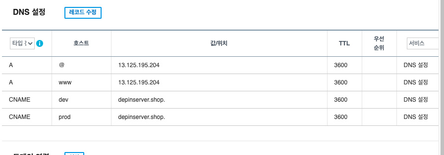 A type의 값들은 본인 인스턴스의 ip주소를 넣어주고, CNAME의 값들은 DNS명을 적어주면 된다.