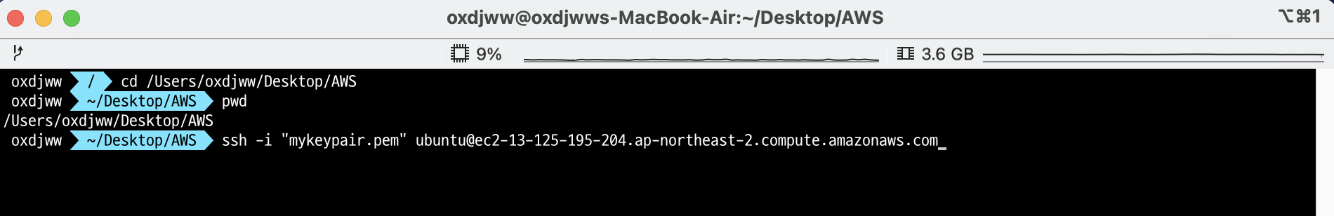 $ ssh -o "키페어이름.pem" ubuntu@"퍼블릭 IPv4 DNS"