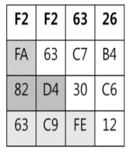 원소가 1 byte(8bit)인 4*4 matrix로 변환된다. (4*4*8 = 128bit)