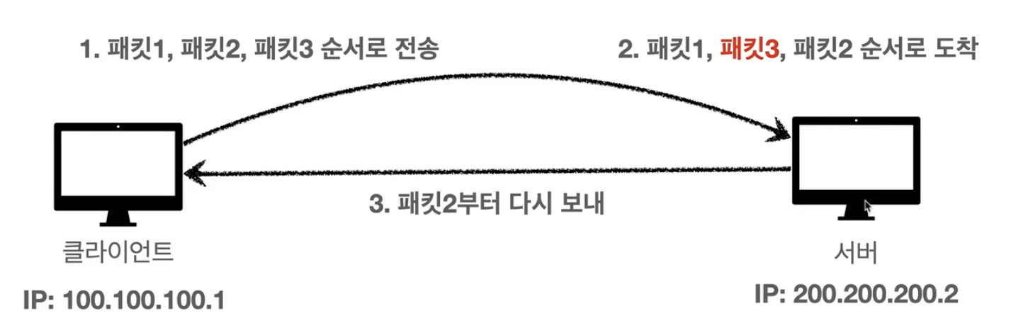 TCP 기반 통신에서 데이터를 송신할 때, 데이터의 순서가 잘못되면 이 순서를 보장할 수 있도록 재전송이 이루어진다.
