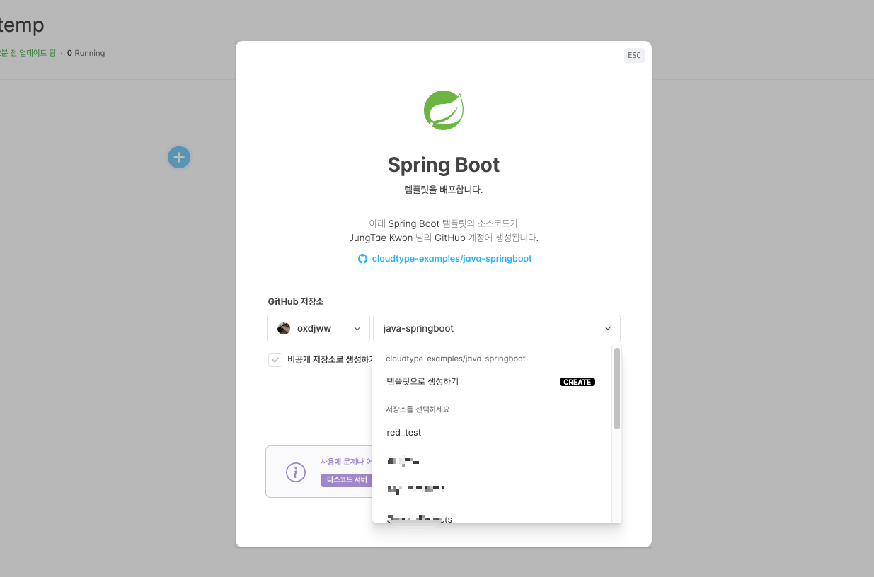 파란색 + 버튼을 클릭 후, 본인이 배포하고자 하는 템플릿인 SpringBoot를 선택해주었다.