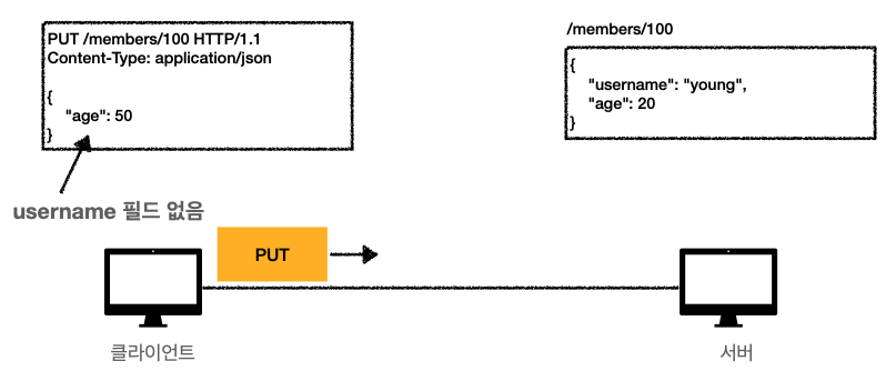 age값만 업데이트 하고 싶은데 이렇게 username을 공란으로 두고 PUT 메서드를 사용하면..username가 없는 새로운 리소스로 대체된다.