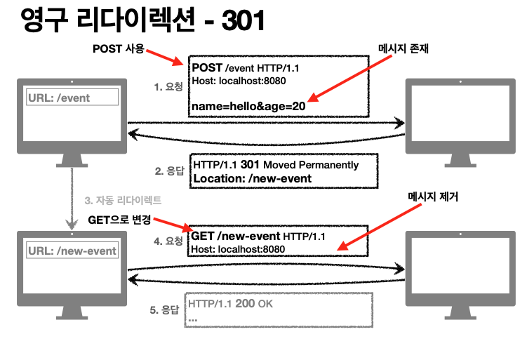 - 하지만 대부분 웹 브라우저들이 GET으로 바꾸어서 리다이렉션을 한다.