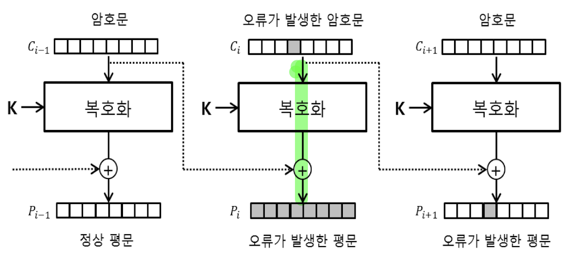 Ciphertext i에서 에러 발생시 Plaintext i, Plaintext i+1만 영향 받음
