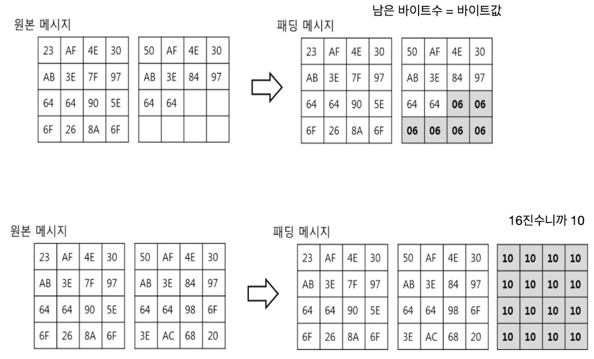 - 패딩은 평문의 전체가 블록 크기의 배수가 되도록 마지막 부분의 빈 공간을 채워 하나의 완전한 블록으로 만드는 작업