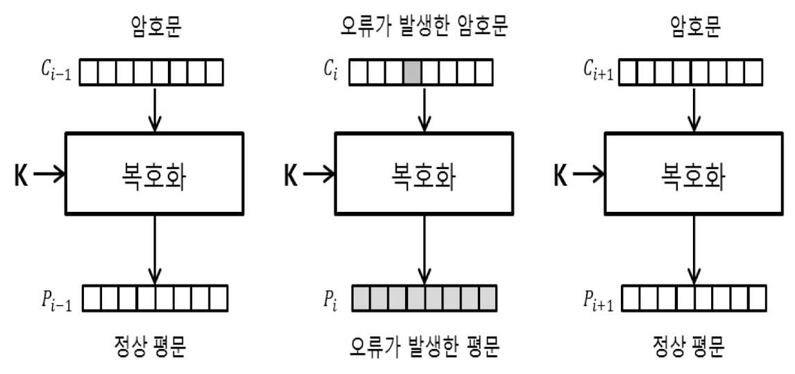 → 한 비트 오류 시 한 평문 (8비트) 전체가 에러남