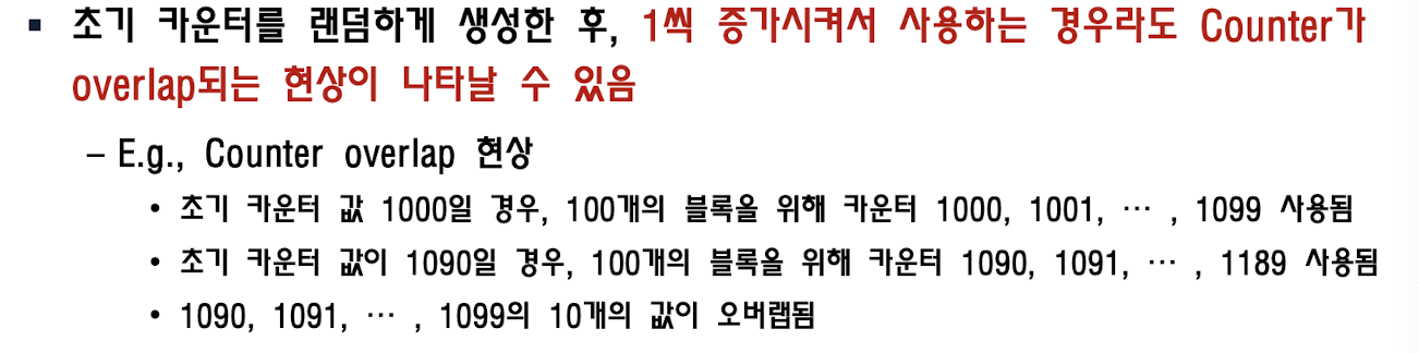 다른 평문에 대해 같은 카운터가 쓰이면 보안문제가 발생하기에 주의해야 한다.