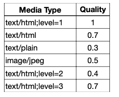 Accept: text/*;q=0.3, text/html;q=0.7, text/html;level=1,text/html;level=2;q=0.4, */*;q=0.5