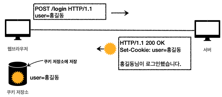 Set-Cookie: 서버에서 클라이언트로 쿠키 전달(응답패킷에서)Cookie: 클라이언트가 서버에서 받아 저장해놓은 쿠키를 HTTP 요청시 서버에게 전달