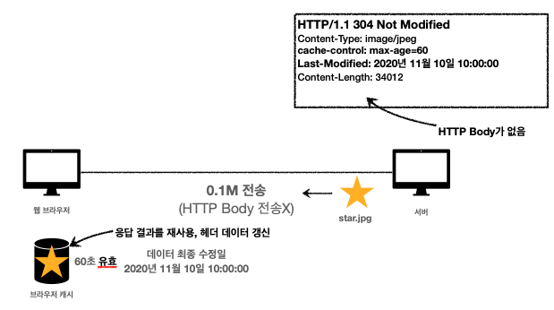 - 304 Not Modified + 헤더 메타 정보(start-line)만 응답(바디X)