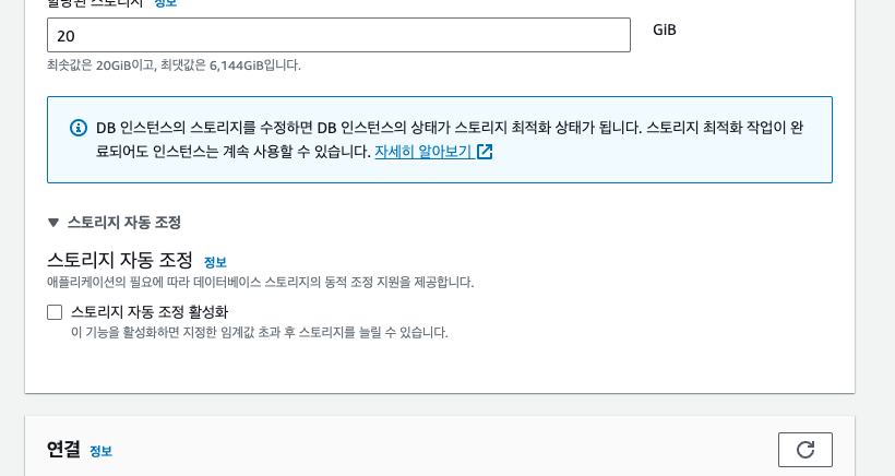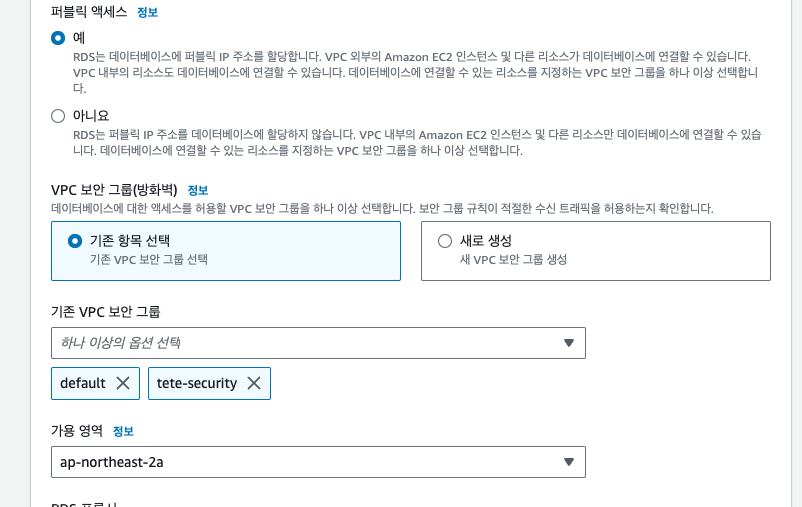 외부 접속을 위해 퍼블릭 엑세스를 활성화하고, 자동 백업은 비활성화 한다.