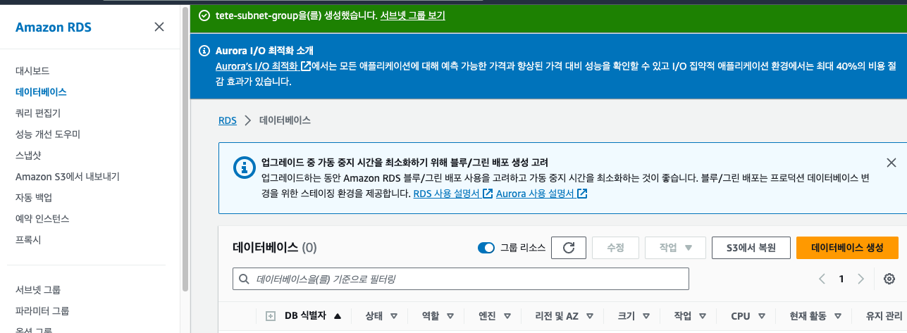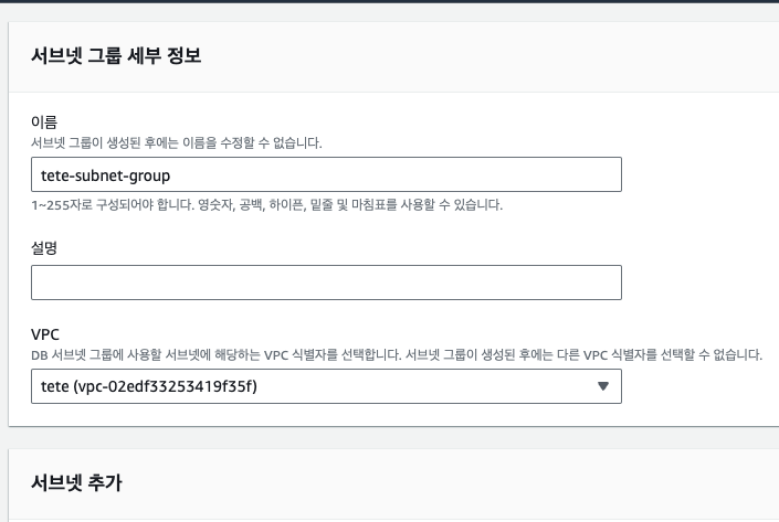 VPC의 subnet에 RDS를 배치할 것이므로 이에 맞는 DB subnet을 생성한다.