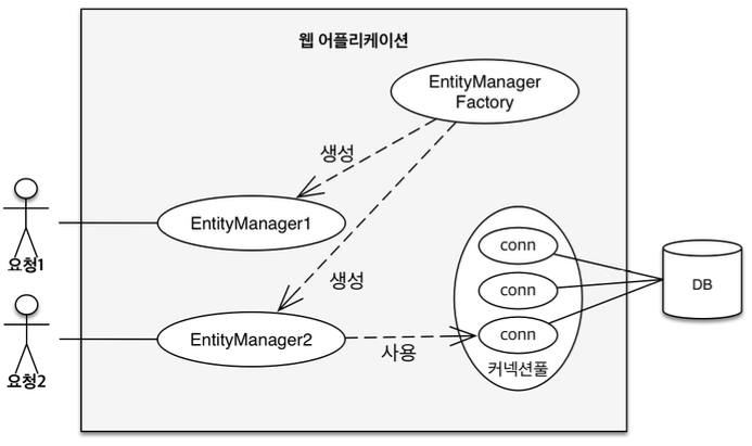 웹 어플리케이션에서 사용자는 EntityManager를 할당받고, Database에 접근하기 위해 EntityManager로 엔티티를 영속성 컨텍스트에 집어 넣는다.
